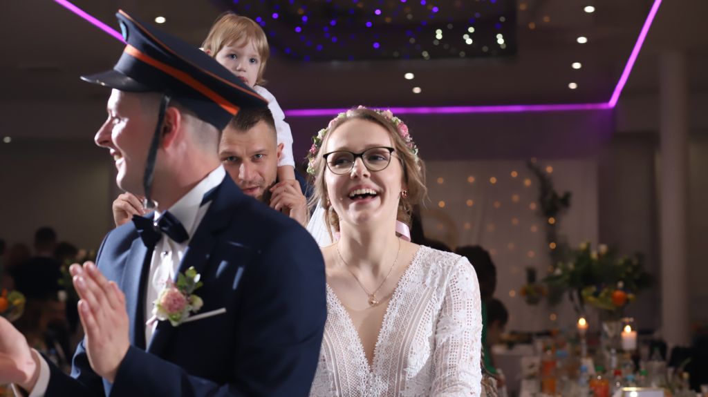 Dwie lustrzanki Canon w pełnej klatce, szelki naramienne, 3-4 lampy błyskowe wyzwalane zdalnie, rozstawiane w rogach sali na statywach